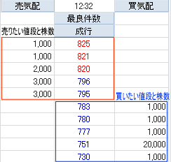 板には現在の市場の状況が反映されています。 上の板では795円で3000株、796円で3000株、820円で2000株売りたいという注文が入ってます。 逆に783円で1000株、780円で1000株、777円で1000株買いたい人の注文が入っています。 ですから、この状態で買いの成行注文を1000株出せば795円で1000株買う事ができます。逆に売りの成行注文を1000株出せば783円で1000株売ることができます。